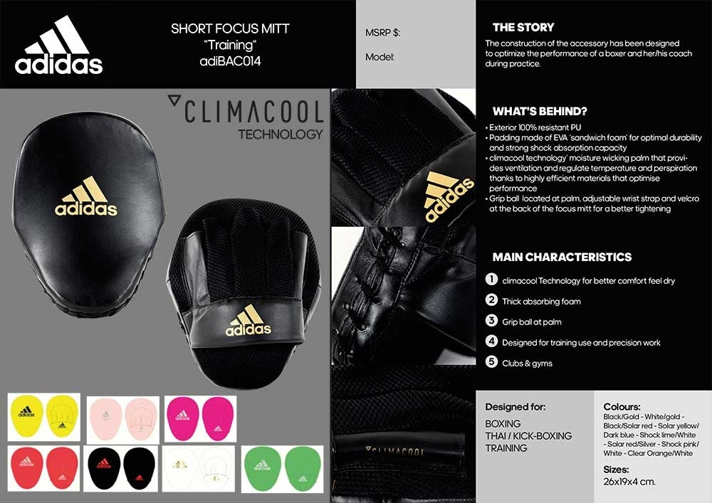 Adidas Focus Mitt i olika färger passar bra för både både Boxing- och Fitnessträning. Tillverkad av ett slitstarkt PU-material som har en polyesterfodring tillsammans med Climacool-tekniken för att absorbera och minska fukt.