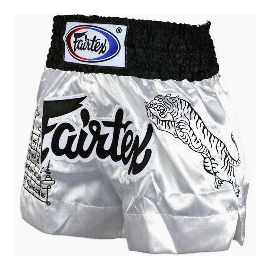 Träna och kämpa med den unika stilen hos Fairtex BS0637 Thai Talisman i vitt. Tillverkade i glänsande satin med hög slitstyrka och handgjorda i Thailand.